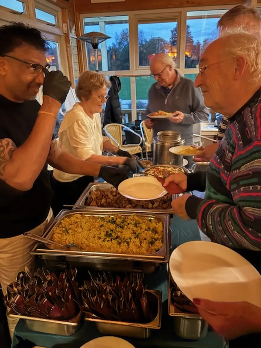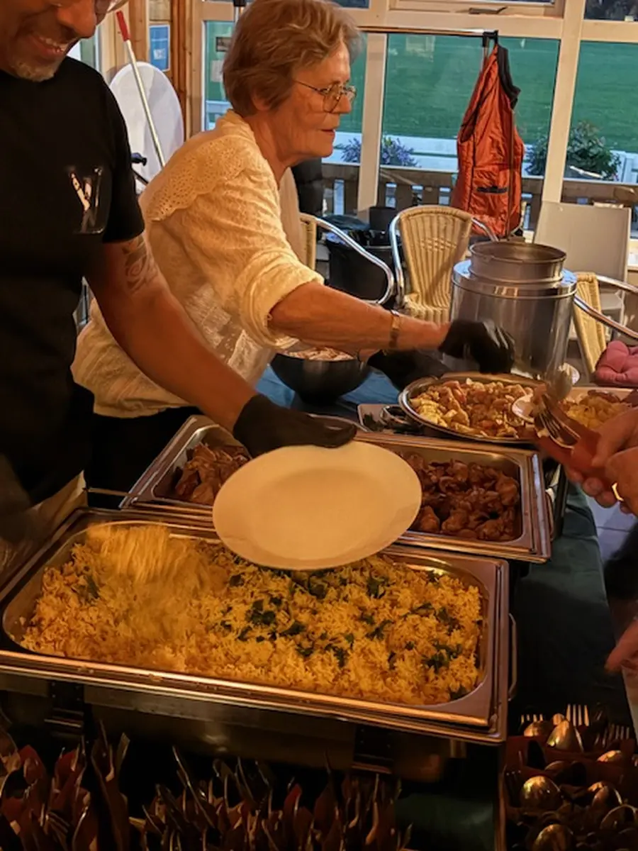 Na een beetje op verhaal gekomen te zijn van de inspanningen, onder het genot van menige drankjes (Trees) en hapjes (Joke) en een dansje te hebben gewaagd, werd het tijd voor de horeca om aan te tonen, dat zij het dit jaar weer voor elkaar gekregen hebben. En ja hoor, iedereen was gemotiveerd om in de gebruikelijke rij aan te schuiven om een deel van al het lekkers (Stephen), dat uitgedeeld werd door Tine en Melvin, te verorberen.