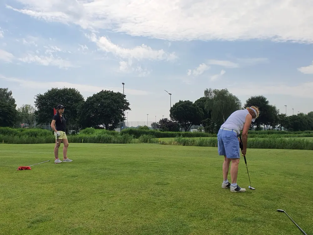 De messen waren geslepen. Beide waren gemotiveerd om dit tot een goed einde te brengen en daarmede de derde plaats in de wacht te slepen. Met 32 slagen over de eerste (polder holes) was Birgit goed op weg. Maar door het aantal slagen welke zij moest prijsgeven aan haar tegenstandster, was het nog maar gelijk bij het begin van de velden holes.