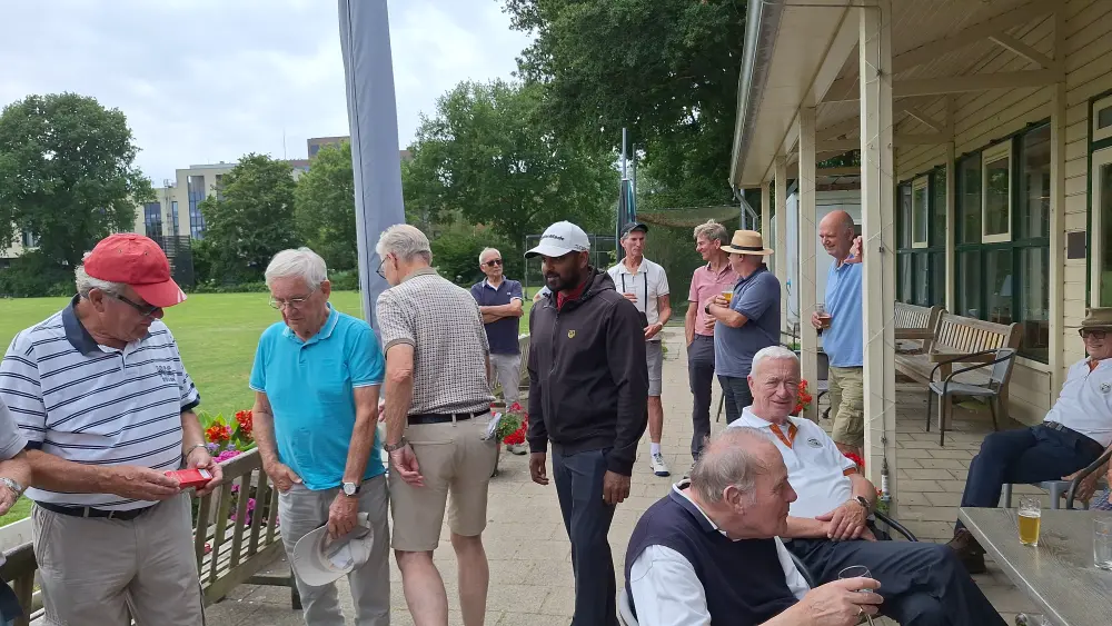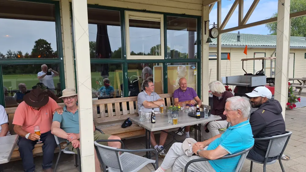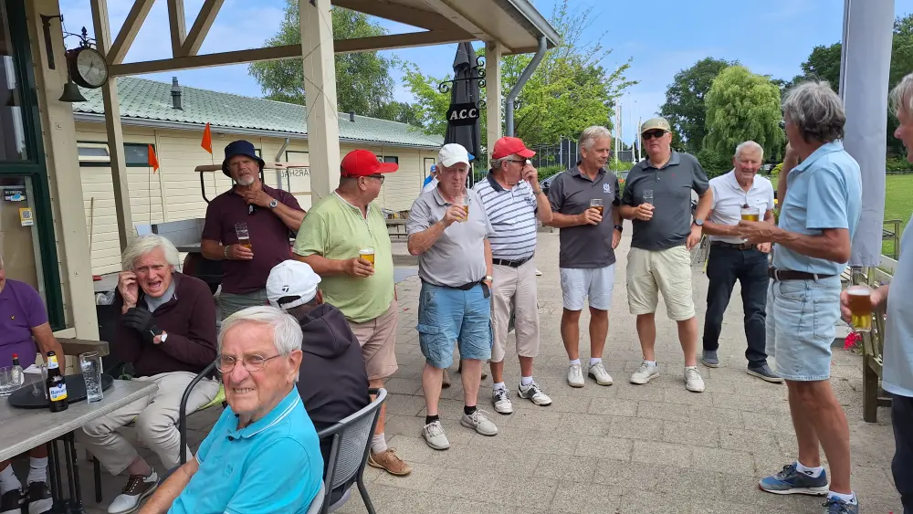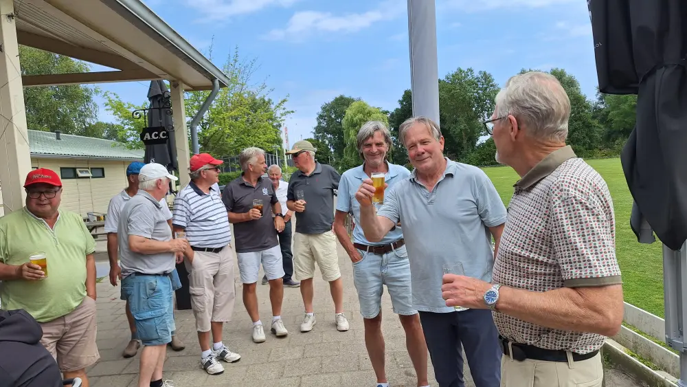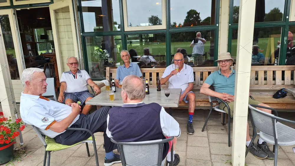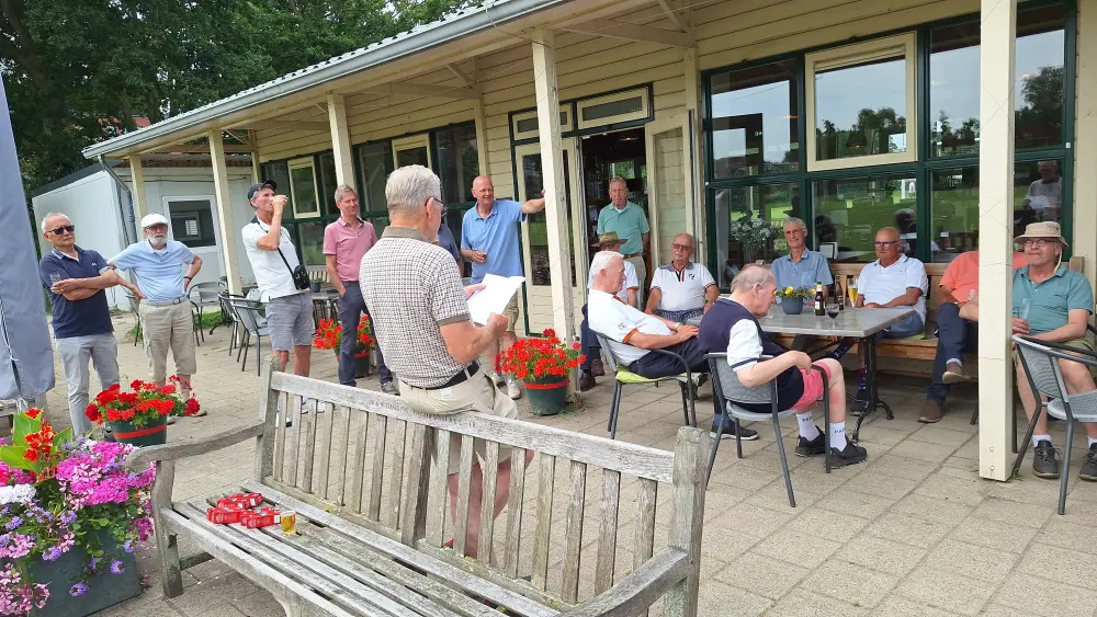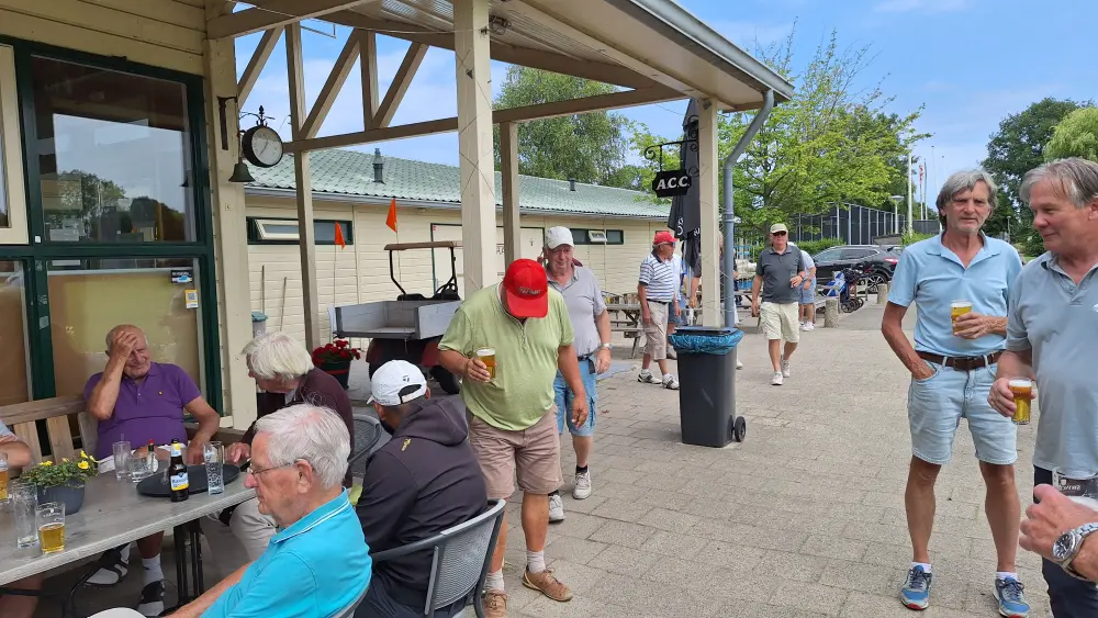Op naar de baan om de 35 spelers aan het werk te zetten, na de indeling ging men aan de slag om na 3 gelopen holes terug te komen en aan te vallen op de haring en korenwijn.