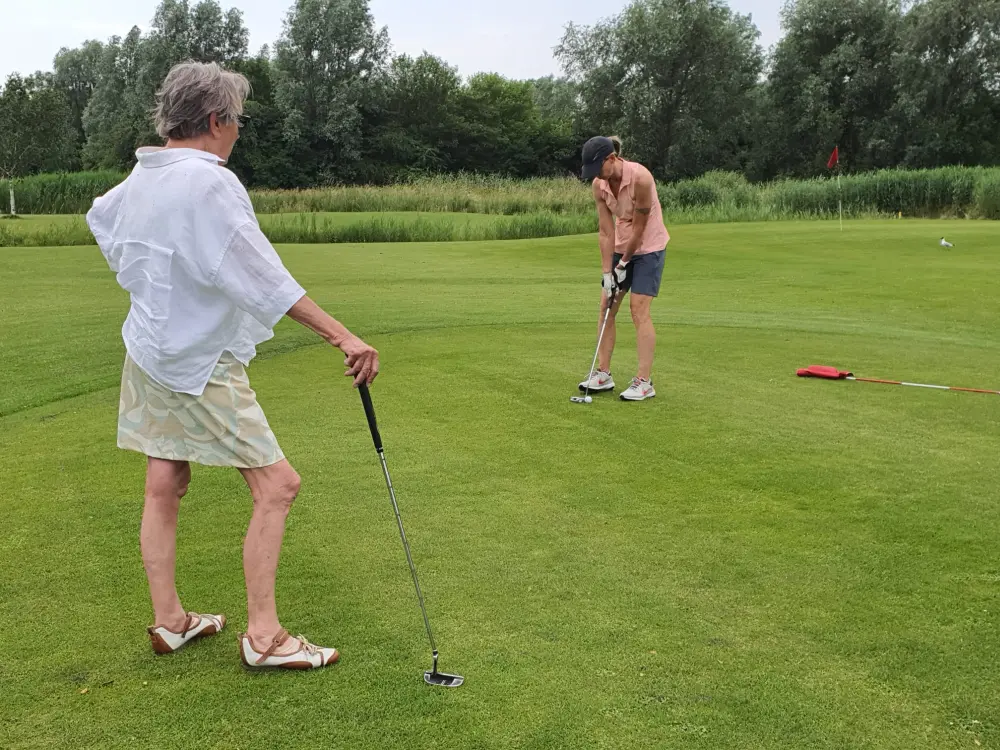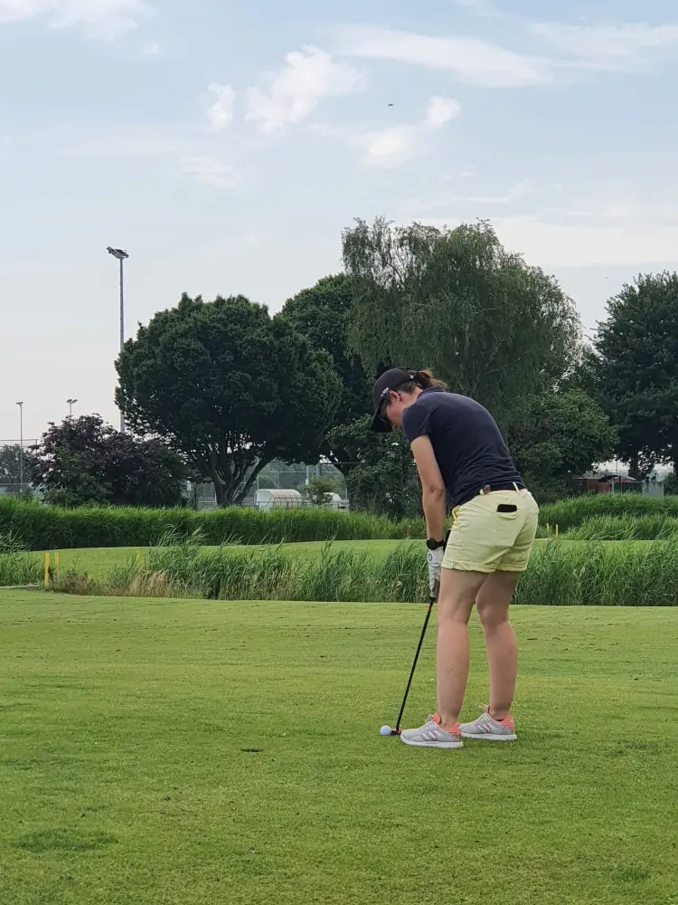 De messen waren geslepen. Beide waren gemotiveerd om dit tot een goed einde te brengen en daarmede de derde plaats in de wacht te slepen. Met 32 slagen over de eerste (polder holes) was Birgit goed op weg. Maar door het aantal slagen welke zij moest prijsgeven aan haar tegenstandster, was het nog maar gelijk bij het begin van de velden holes.